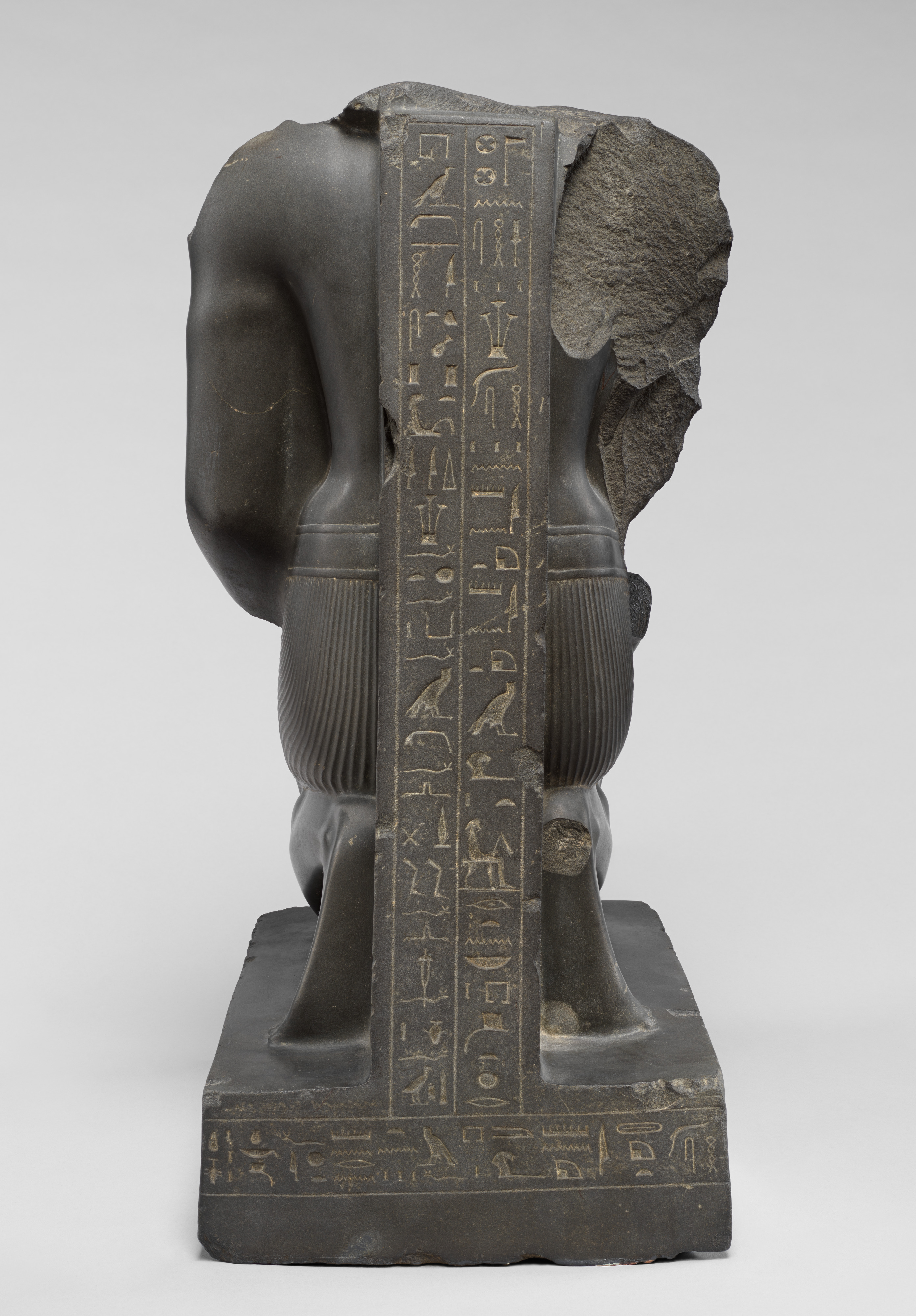 Amenemope-em-hat holds before him the cult object of the cow-eared goddess Hathor. The proportions of this figure, its muscularity, and such details as the slanted ridges of the collarbone and the shallow depression down the center of the torso represent a conscious attempt in the Late Period to emulate the classic works of the Old and Middle Kingdoms.