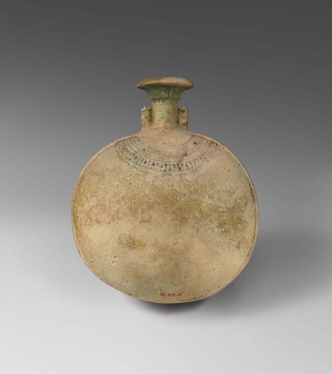 This is an example of a "New Year's Bottle." The short neck is in the form of a papyrus or lotus column, flanked by two squatting apes that take the place of handles.The shoulder is adorned front and back with the representation of a broad collar, echoing a type worn by Egyptians at festive occasions, or a floral garland. Faience flasks of this type, often inscribed with good wishes and apparently filled with water from the Nile, were given as gifts at the New Year.