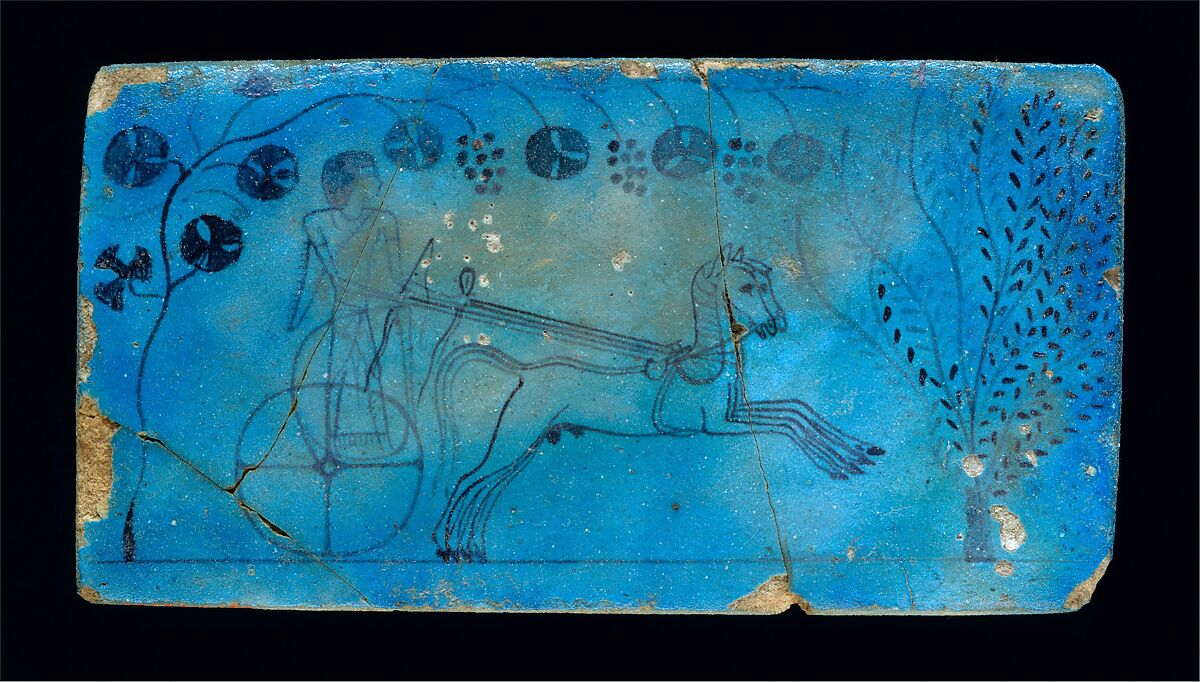 This drawing on faience of a man driving a chariot pulled by two galloping horses in a food-producing garden illustrates how these new means of transport were gradually adopted by people outside the Egyptian court and army.