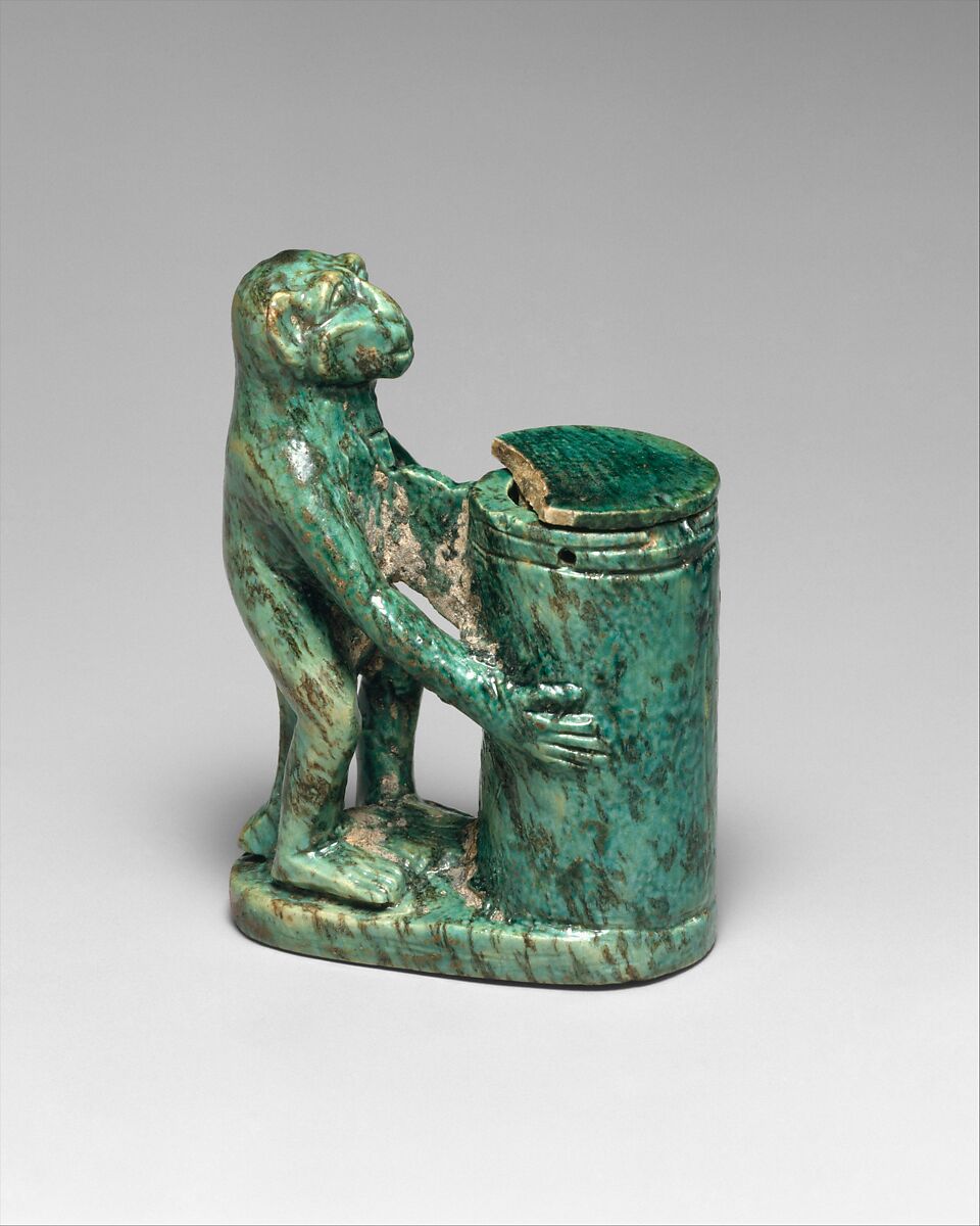 The Egyptians' use of eye cosmetics to enhance beauty and for prophylactic purposes is well documented both in artistic representations and by the cosmetic vessels that have been preserved from the earliest times. The most common substance utilized in the New Kingdom was kohl, a dark gray powder made from galena. Kohl was frequently stored in decorated tubes with long, slim sticks made of polished wood or stone as applicators. As in earlier periods, representations of monkeys often decorated cosmetic vessels in the New Kingdom. In this example the monkey stands balanced on its tail, its left leg slightly forward and its hands clasping a kohl tube. The ears, the ridges above the eyes, the nose, and the tufts of hair on the cheeks were carved with care. The stone was covered with a thick glaze ranging in color from light to dark blue-green, but the grain of the stone is still visible, giving the impression of heavily veined turquoise.