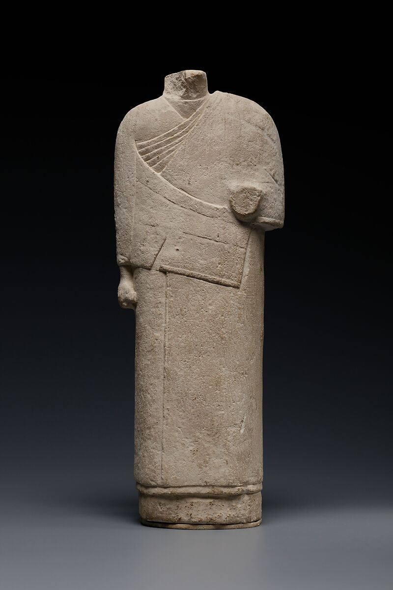 This enigmatic piece has not yet been fully explained. It was probably a sculptor's model: it lacks a back pillar, no head or feet were intended, and the arms were treated in a rudimentary fashion. The artist's interest appears to have been in the garment rather than the body beneath. This may be the earliest three-dimensional version of a costume that became popular in the Ptolemaic Period.