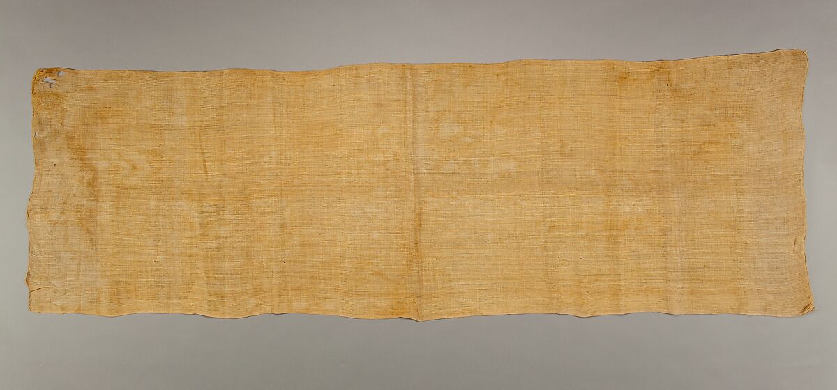 This length of cloth has a woven selvage along one side. The other side and both ends are finished with rolled hems. There is also a weaver's mark woven into one corner of the fabric. Theis is probably a garment that was tied around the waist as a sash or a kilt and it was found with a shirt (similar to 36.3.174) in a bundle of linen that was placed inside the coffin of a middle-aged man whose name was not preserved. He had been buried on the hillside below the tomb of Senenmut (see 36.3.252). A number of burials were discovered on this hillside, including the tomb containing Senenmut's mother, Hatnefer (36.3.1), his father, Ramose, and six other family members. It is possible that the un-named middle-aged man was another relative or a member of Senenmut's household who was buried where his spirit could benefit from the daily offerings that would be presented at Senenmut's offering chapel.