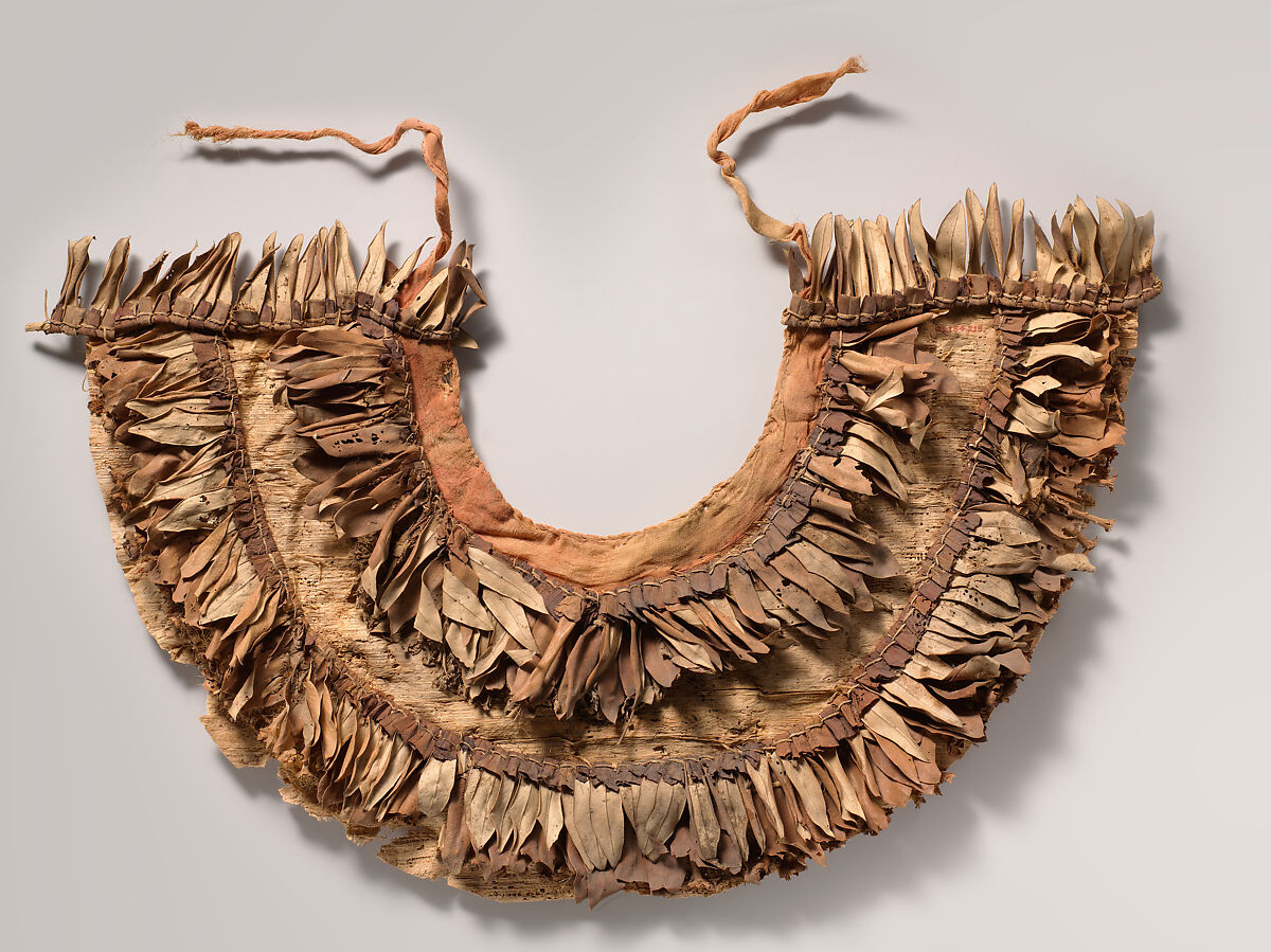 This remarkably preserved floral collar, from the funerary cache of Tutankhamun, illustrates how the broad collars so frequently depicted in Egyptian tomb paintings were made. Alternating rows of flower petals and blossoms, leaves, berries, and blue faience beads were sewn to a papyrus backing, and linen ties secured the collar around the wearer's neck. Some of the flora used in the Tutankhamun collars have been identified as olive leaves, cornflowers, and poppies. Several collars in the cache, like this one, were bound around the edge with red cloth, and the resulting combination of red, blue, black, and green must have been very colorful and similar to the polychrome decoration on some of the terracotta vessels in same deposit (09.184.99).