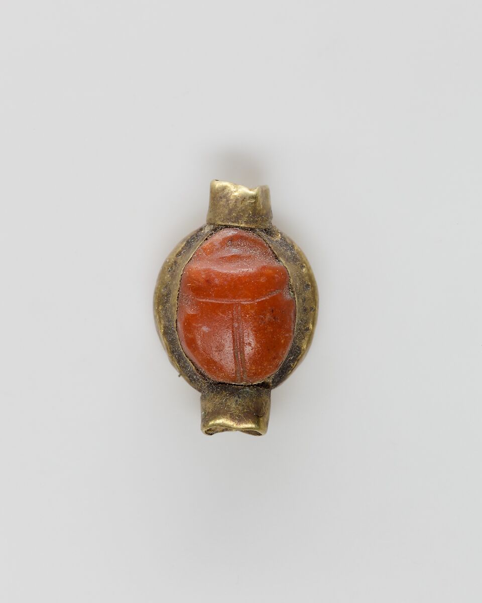 This carnelian scarab is set in a gold mount that was intended to swivel on a wire ring like one found in the tomb of Hatnefer (36.3.3). On the base, it is inscribed with a simple X.