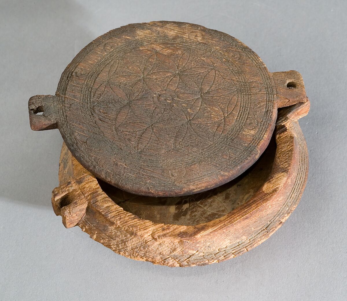 This box has a swivel top incised with a decorative pattern of concentric and overlapping circles that must have been made with an early version of a drawing compass. The inside of the box was incised with a simple rosette design. The box was found inside a coffin discovered in the tomb of Hatnefer. Other objects in the Museum's collection that were found in the same coffin include: a bowl and two dishes of faience (36.3.9–.10); two mirrors; and five amulets (36.3.20–.24).