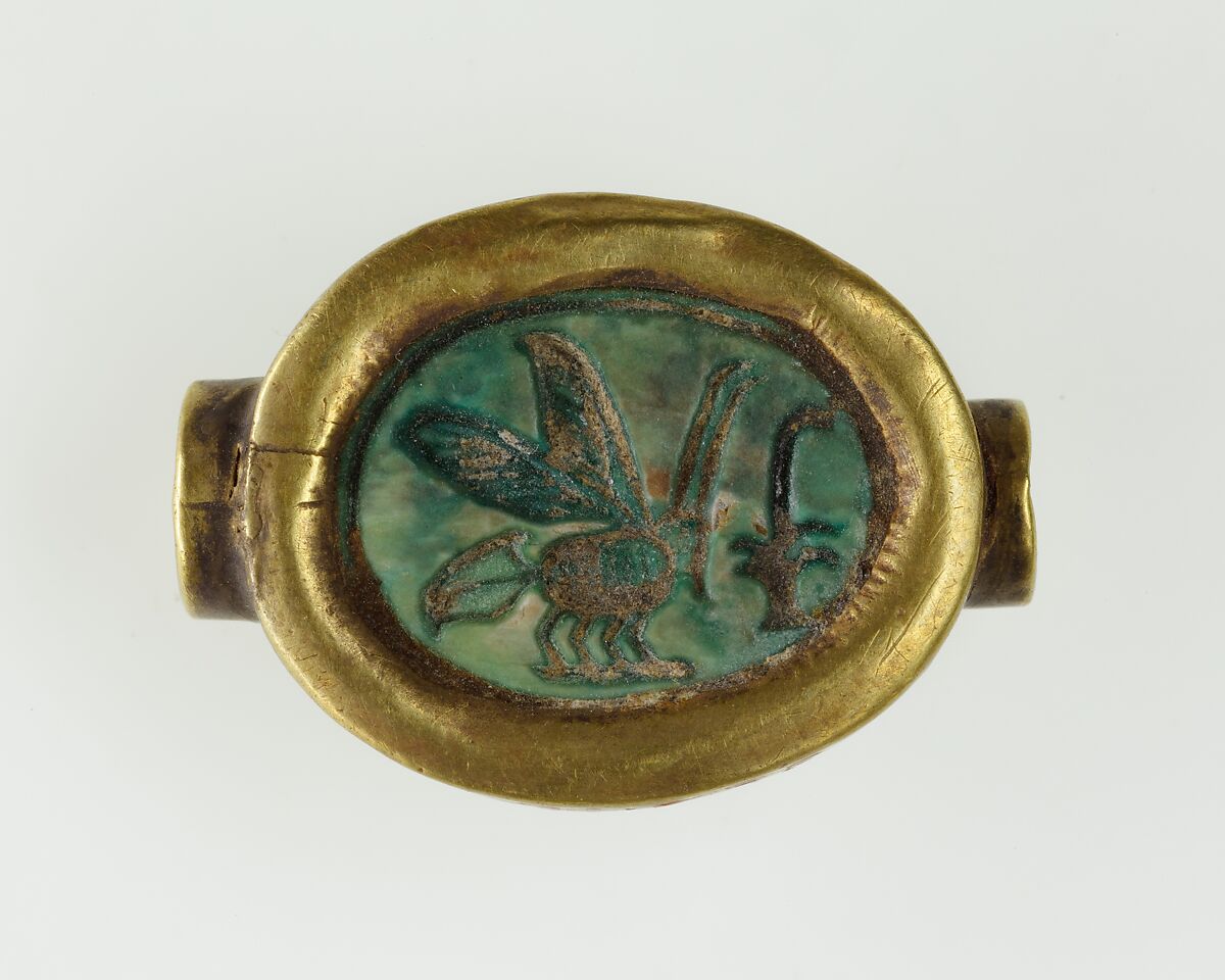 This scarab ring bezel was found among the hand bones of one of the unidentified adult woman buried in the tomb of Hatnefer and Ramose (see 36.3.1). The well-carved scarab is inscribed on the base with a sedge plant, symbol of the Nile valley (Upper Egypt) and a bee, symbol of the Nile delta (Lower Egypt). These two hieroglyphs represent the royal title King of Upper and Lower Egypt.