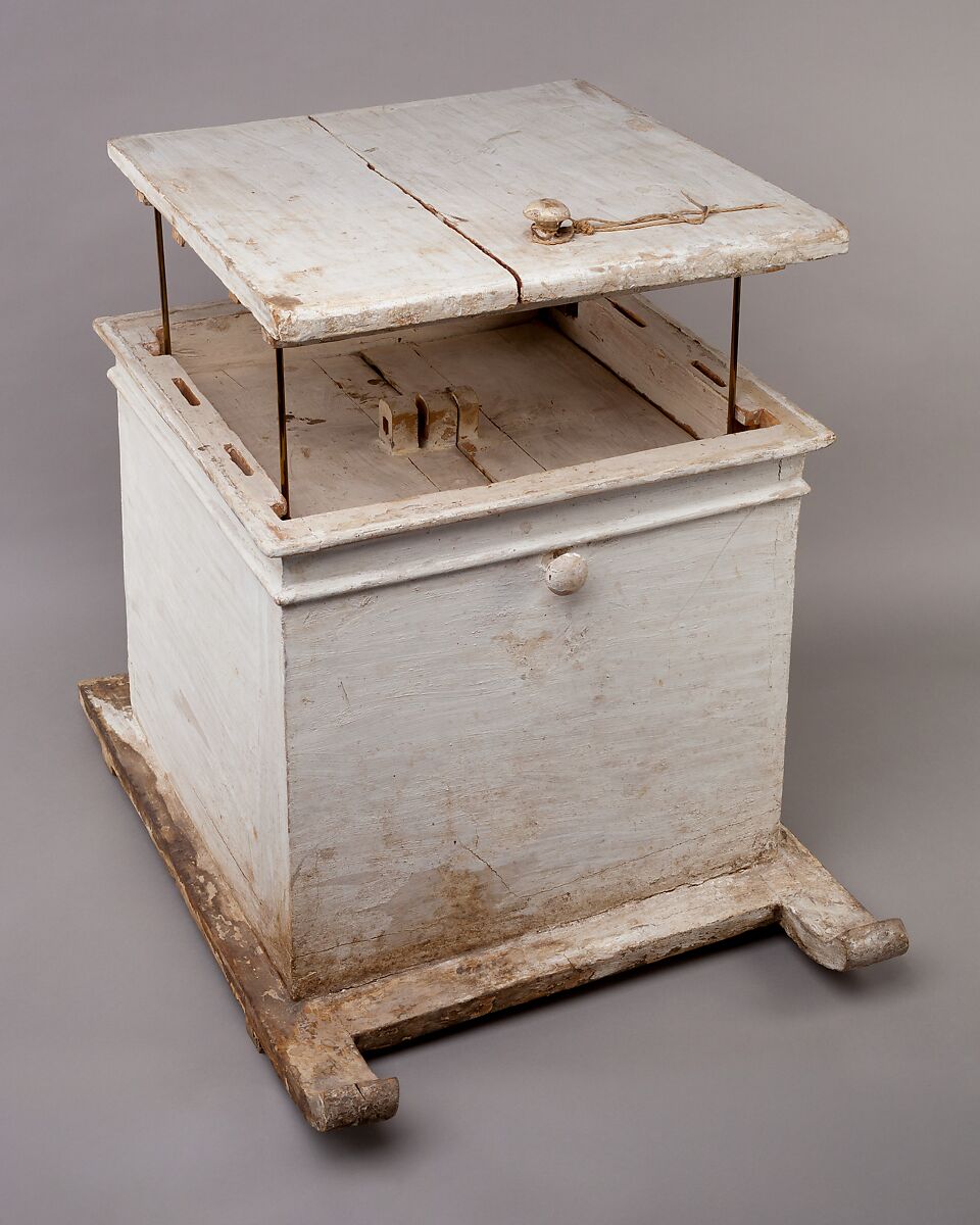 The box and lid are made of cypress which has been covered with a layer of linen and gesso, and painted white. Inside the two leaves of an inner lid pivot open to reveal four compartments that held the four canopic jars containing Hatnefer's internal organs (for a group of canopic jars from about the same period, see 12.181.253a–c). The box and lid have been constructed in the shape of a shrine and the base has two runners that imitate a sledge. Sledges were the most efficient way to transport large objects over mud roads and sand in ancient Egypt (see 24.1.84 for an actual sledge).