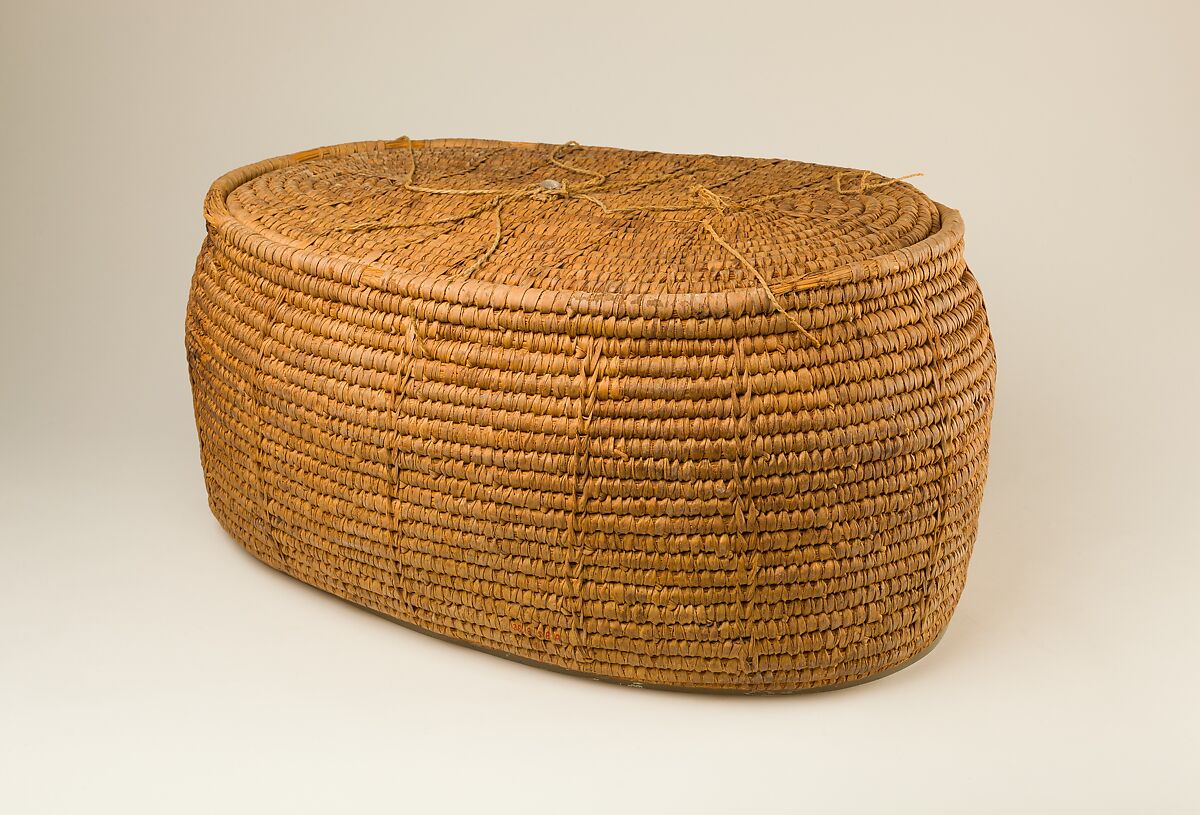 This storage basket was discovered in the tomb of Senenmut's mother, Hatnefer (36.3.1), who lived into the reign of Hatshepsut. The basket is made of halfa grass coils sewn together with strips of palm leaf. It was tied shut using pieces of linen cords attached around the top edge of the basket. Then a mud seal was pressed over the knot at the center of the lid. The basket had been filled with soiled bandages that had probably been used in the embalming process for one of the mummies in the tomb.