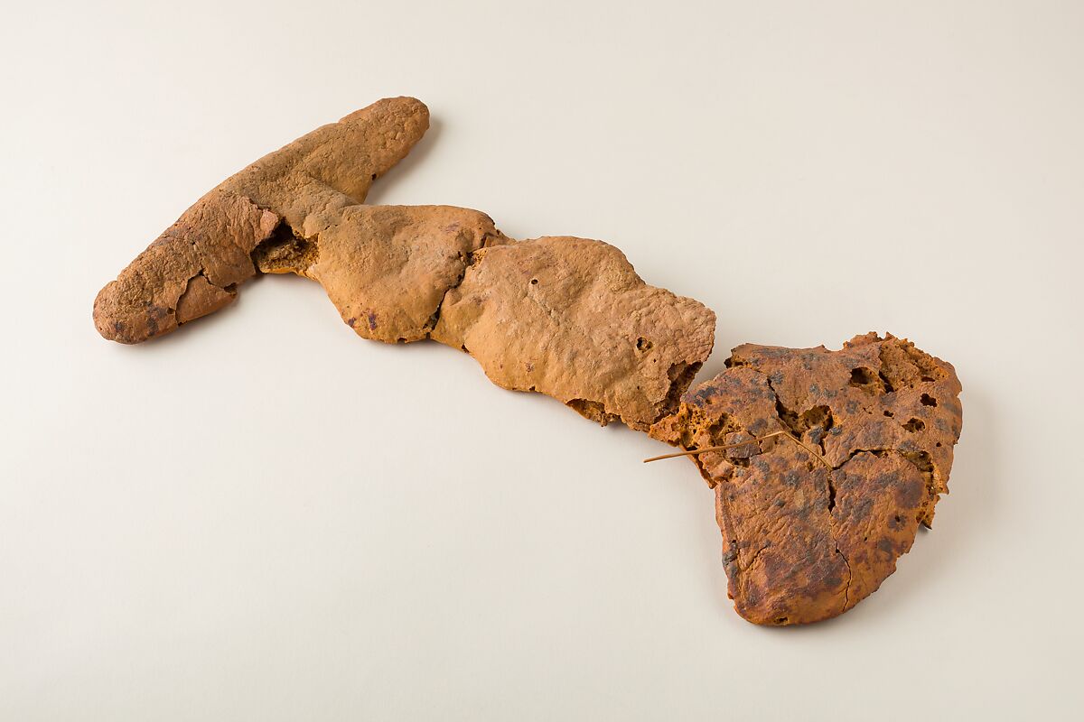 This unusually shaped loaf of bread was found in a basket of food (36.3.57) that had been placed in the tomb of Hatnefer (36.3.1). Two other fragmentary loaves of similar shape were also found in the basket. There were also other, more conventional loaves (36.3.73, 36.3.74, 36.3.78), raisins (36.3.65), and dates (36.3.66).