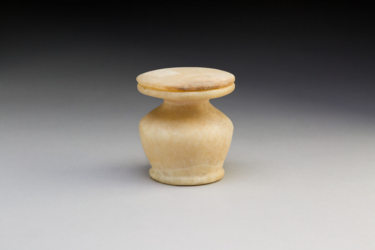 This Egyptian alabaster kohl jar was found with two other alabaster jars inside the coffin of a scribe named Amenemhat. The jars had been placed near the head of the mummy along with a bundle containing knives, razors, and a whetstone. All three were well made from fine-grained white stone. This one contained the remains of powdered antimony, or kohl, an eye makeup used by both men and women.