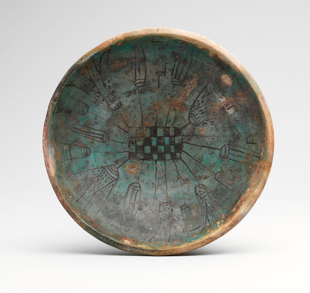 This and a second bowl (35.3.78) were found with the burial of a woman named Rennofer in the tomb of her husband, Neferkhawt. Like many faience bowls of early Dynasty 18, this one is decorated on the inside with lotus blossoms and buds growing from a pond which is painted like a checker board.