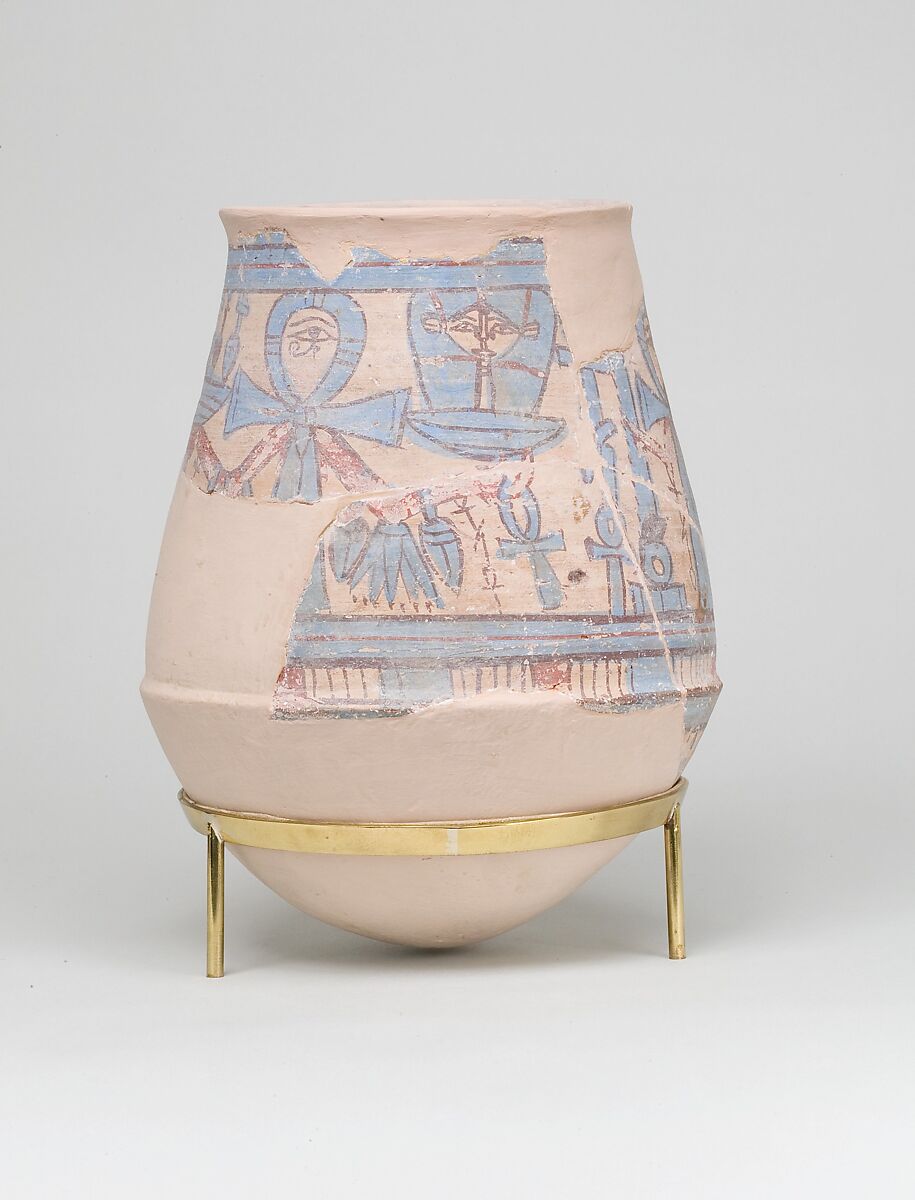 This jar has been decorated with a series of personified ankh hieroglyphs. Each ankh has an eye of Horus, or "wedjat" eye, painted in the loop at the top, and two outstretched arms painted red. The best preserved ankh holds two baskets, one of which contains an emblem of the goddess Hathor (see also 11.215.472).