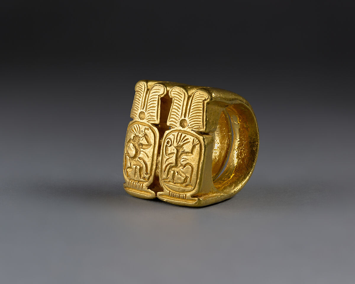 The ring bezel is decorated with the royal device of two cartouches topped by ostrich plumes. The cartouches frame dancing figures of Bes, a minor god who frightened away demons and killed snakes and other harmful animals. Bes was closely associated with women in labor and with small children, and use of his image on this ring suggests that it belonged to a queen.