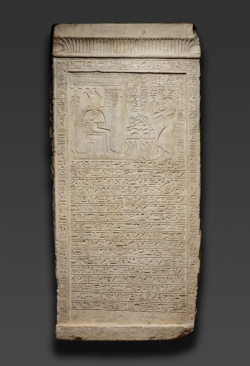 This funerary stela, belonging to the royal Scribe and Overseer of the Royal Harem, Ptahmose, contains four separate offering prayers to Ptah-Soker-Osiris. Above the main text, Ptahmose himself appears, worshiping the god. The form, style, and text of the stela point to Memphis as its place of origin.