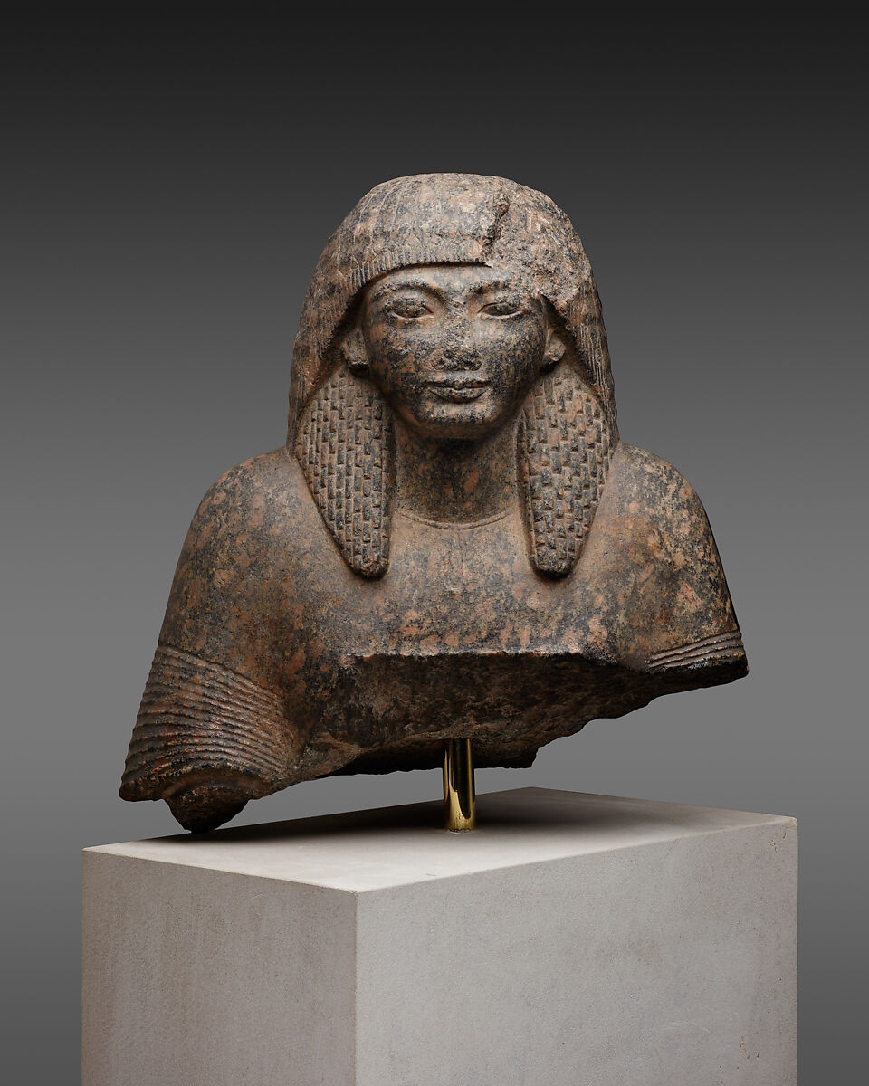 Naophoroi—statues that show their patron presenting the image of a deity within a naos (Greek for ‘shrine’) –like this one were found in tomb and mainly temple contexts. First appearing in the Eighteenth Dynasty, they are understood to express their owner’s devotion as well as mutually beneficial protection between the dedicant and the deity. This shrine probably housed an image of the god Osiris, whom the inscription on the back pillar names.