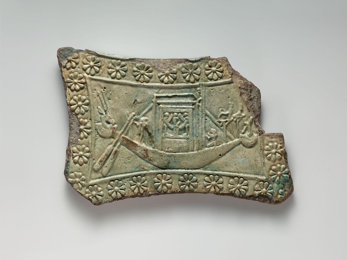 Faience model tambourines such as this one were festival offerings to Bastet, who, like the other great goddesses, is associated with the myth in which a daughter or quasi-daughter of the god Re had to be lured back to Egypt from self-imposed exile in Nubia. At festivals in Bubastis celebrating Bastet's return, the goddess sailed upon her Isheru, or temple lake, which is the event being illustrated on the model tambourine.