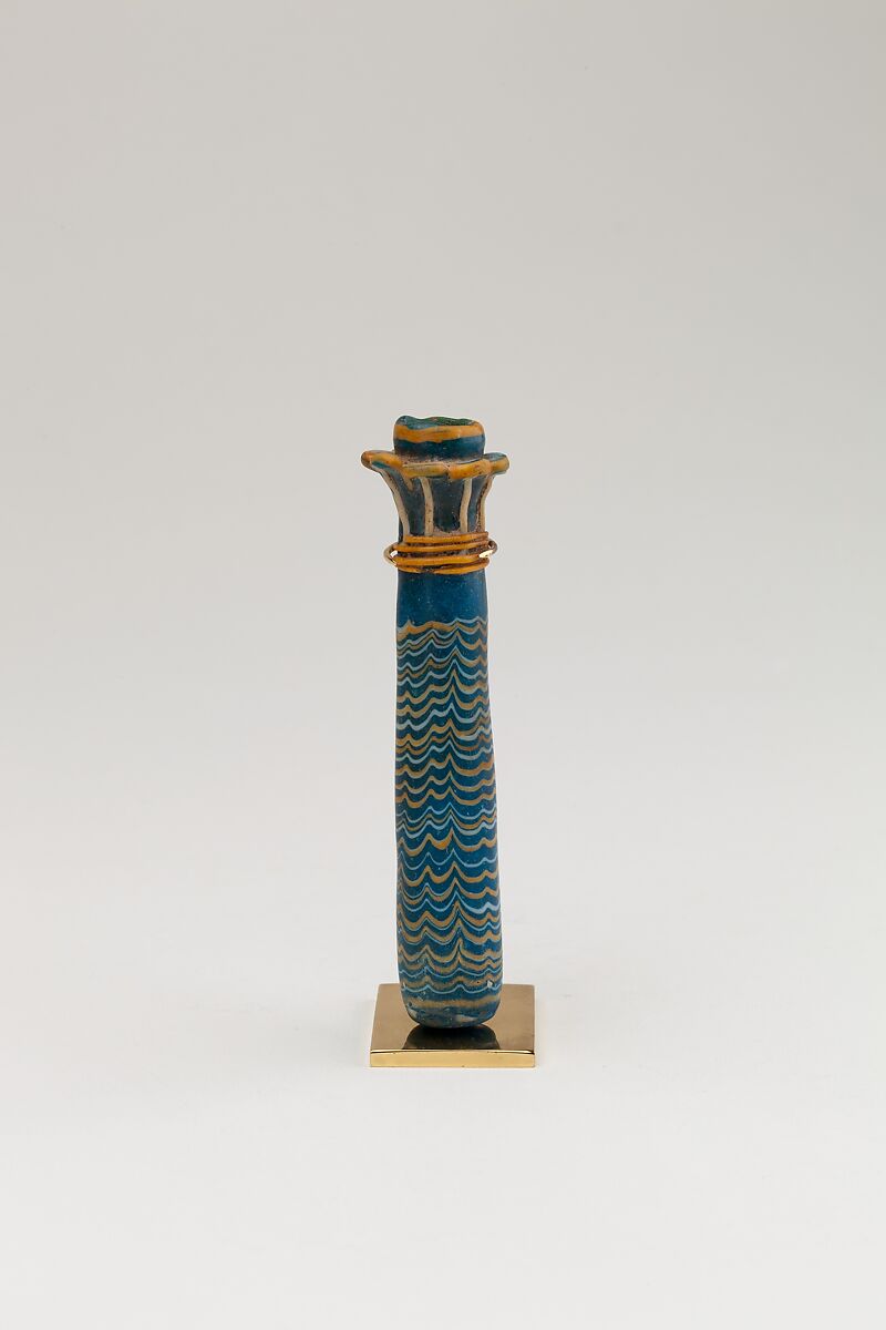 Egyptian glassmaking, which had reached a high level of virtuosity in late Dynasty 18, continued to be practiced in the Ramesside Period; however, the quality, as well as quantity, of it production dropped off sharply in Dynasty 20. The "feathered" decoration of this kohl tube was achieved by winding thin colored glass rods around the vessel and pressing them onto the surface of the vessel while it was still soft, and then drawing the rods up or down with a metal instrument. This kohl tube in the form of a palm column is apparently the half of a double tube.