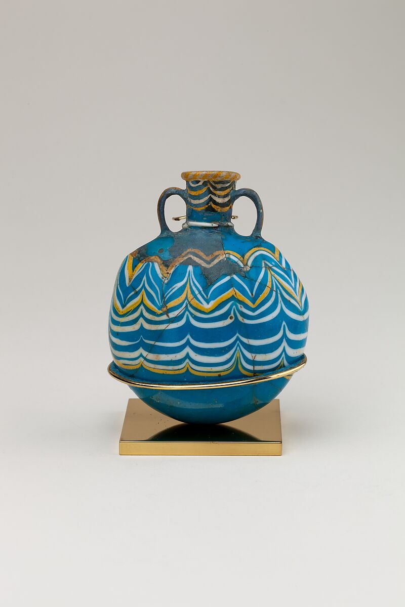 Egyptian glassmaking, which had reached a high level of virtuosity in late Dynasty 18, continued to be practiced in the Ramesside Period; however, the quality, as well as quantity, of it production dropped off sharply in Dynasty 20. The "feathered" decoration of this bottle was achieved by winding thin colored glass rods around the vessel and pressing them onto the surface of the vessel while it was still soft, and then drawing the rods up or down with a metal instrument.