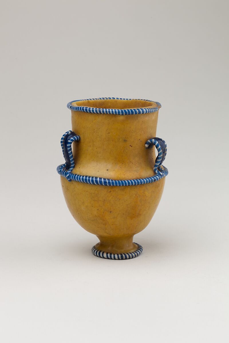 Egyptian glassmaking, which had reached a high level of virtuosity in late Dynasty 18, continued to be practiced in the Ramesside Period; however, the quality, as well as quantity, of it production dropped off sharply in Dynasty 20. The vase here is characteristic of its time, as it is monochrome with only a "rope" made of stained glass rods in contrasting colors attached to the rims, shoulders and feet of the vessel.