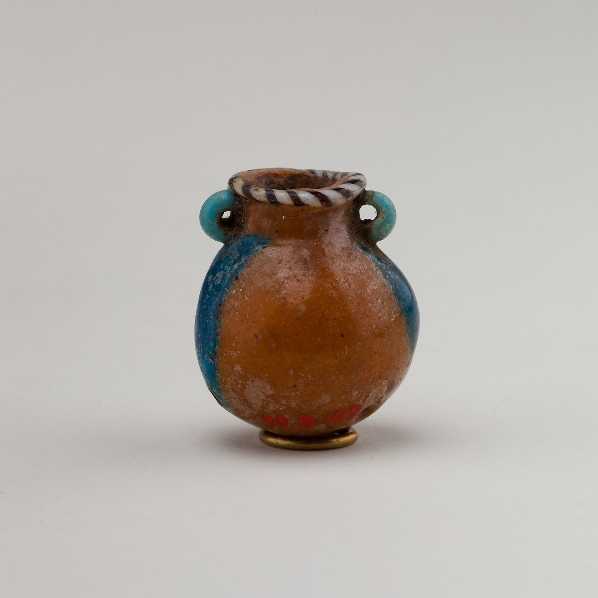 Egyptian glassmaking, which had reached a high level of virtuosity in late Dynasty 18, continued to be practiced in the Ramesside Period; however, the quality, as well as quantity, of it production dropped off sharply in Dynasty 20. The "rope" made of stained glass rods in contrasting colors attached to the rim of this miniature bottle is a characetristic feature of glass vessles of this time.