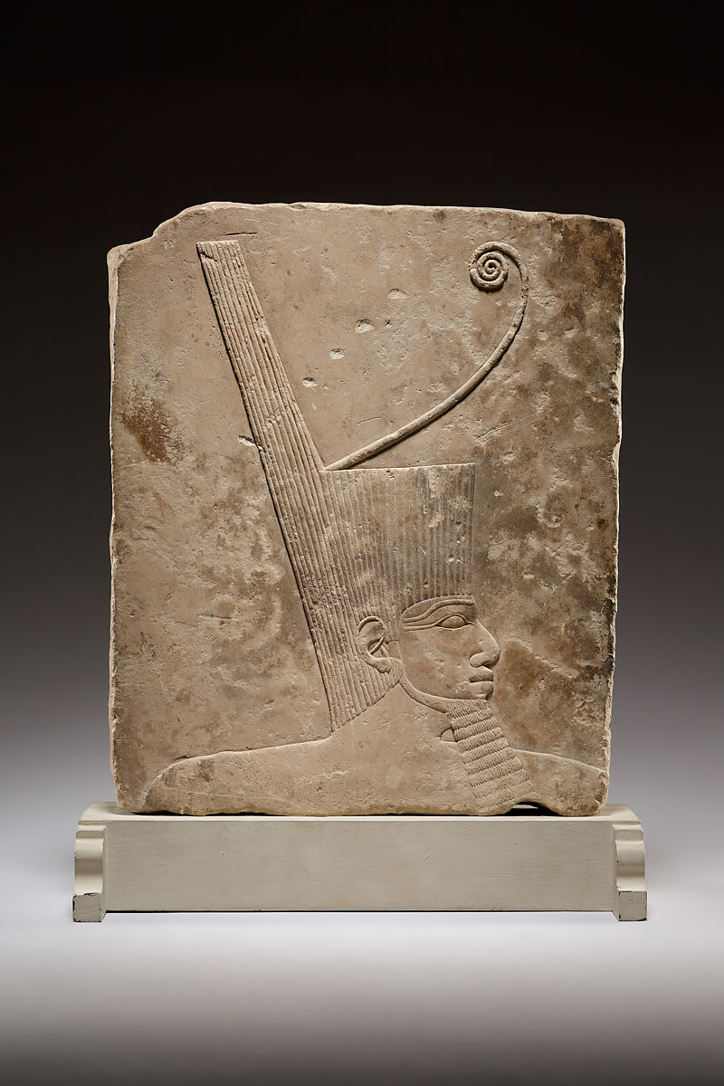 This limestone plaque is finely carved in low relief, featuring the head and shoulders of a king facing right. On the king's head is the Red Crown associated with Lower (northern) Egypt; an exquisitely detailed ceremonial beard has been strapped to his chin. The king is bare-chested, although some clothing might once have been added in paint.