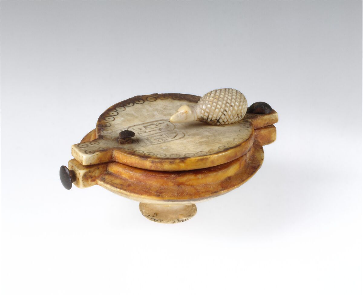This lenticular box with a sharp shoulder and flat swivel lid sits on a cylindrical foot. Around the outer edge of the lid and on one of the flat surfaces for the knobs used to close the container are incised circles. The tiny figure of an animal of some sort sits in front of the other knob. On the lid are the cartouches of Ramesses II and his first principal wife, Nefertari. The purpose of the box is uncertain, but it was likely used for cosmetics.