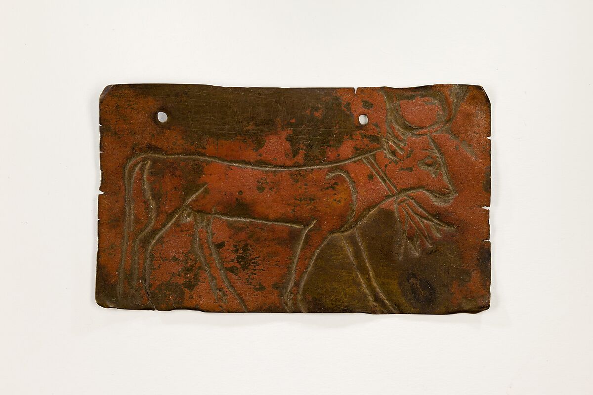 This metal plaque depicts a cow with a sundisk between its horns, which is a common representation of the goddess Hathor. From the cow's neck hangs a lotos flower. The piece was excavated at Deir el-Bahari, close to a shrine for this goddess. Most likely the plaque had been deposited at this shrine, as a donation to the deity. Two holes at the top were probably used for stringing it together with a series of similar small pieces.
