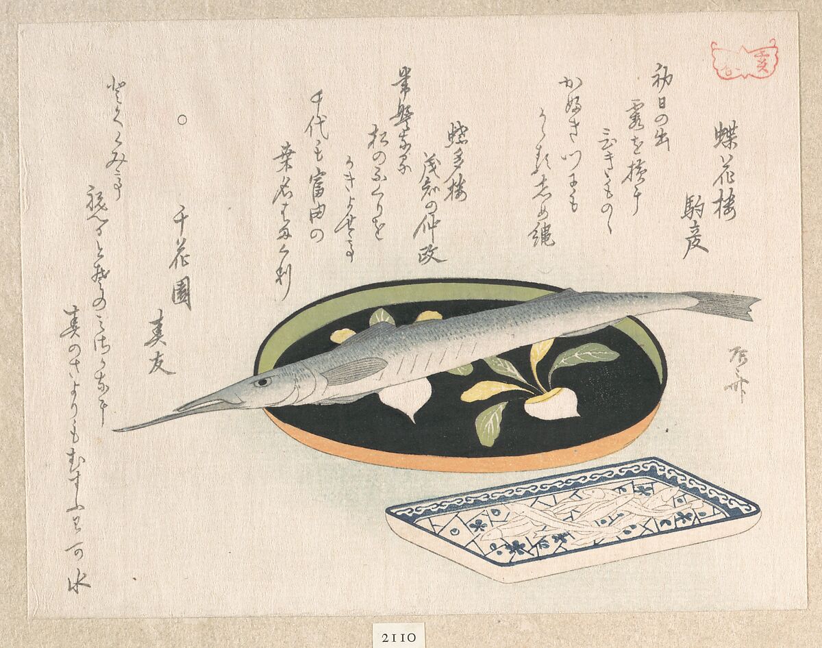 - Title: Halfbeak on a Lacquer Tray with Turnips and White Baits on a Porcelain Dish with Plum Blossoms on Broken Ice