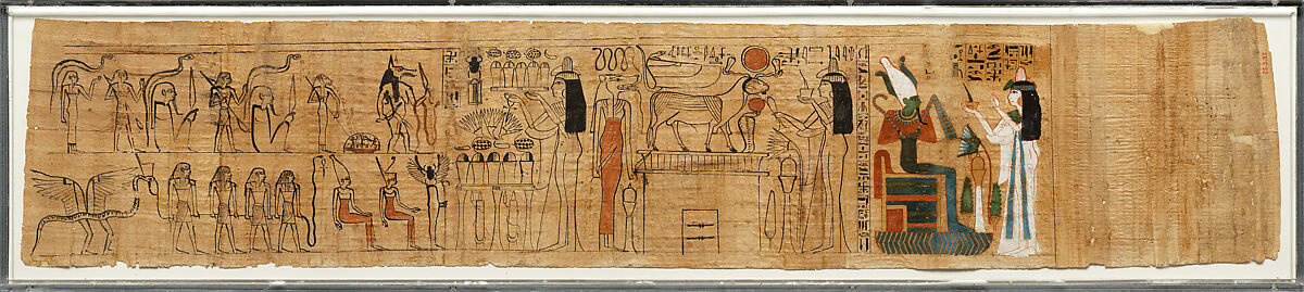 The lady Tiye, a singer in the cult of the god Amun-Re, commissioned this papyrus for her burial, believing that its contents would assist her in entering the afterlife. She has chosen a style that includes little text; instead, her papyrus condenses complex mythological conceptions into abbreviated scenes. The vignette on the right shows Tiye standing before Osiris, principal god of the Netherworld (Duat). At center right, she worships the sun god in the form of a ram, and at center left she stands over an offering table holding a tray of unguent jars, apparently directed toward the various inhabitants of the Duat depicted on the left.