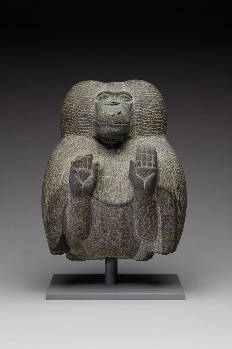 To the ancient Egyptians, baboons were the prototypical adorers of the rising and the setting sun, and their chatter held secret knowledge they hoped to share. The material and quality of the statuette suggests it was a royal donation from Ramesses II, whose name appears on the back pillar.