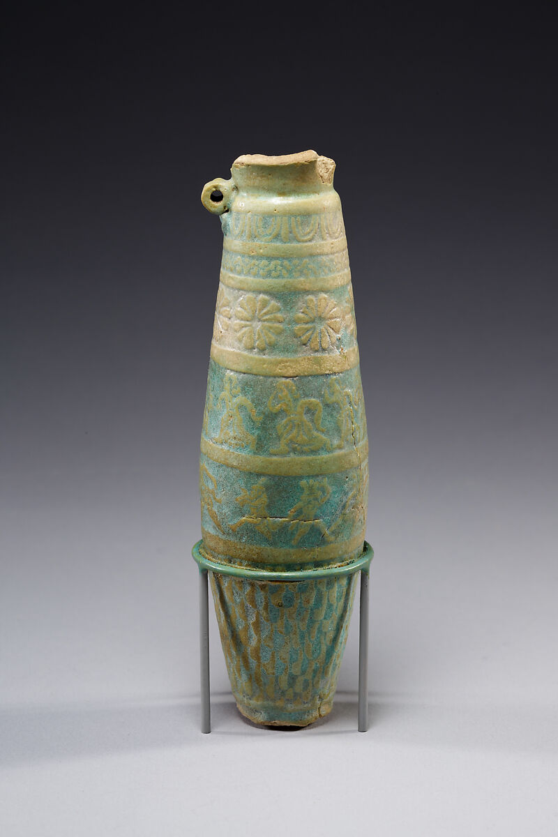 - Title: Biconical alabastron with zones of bichrome decoration including floral elements, dancers, and Bes-like figures