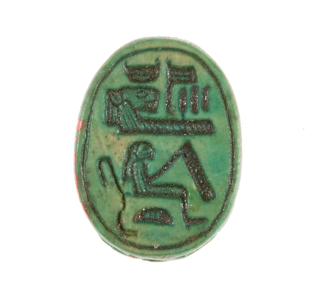 This scarab was found in a foundation deposit associated with Hatshepsut's funerary temple at Deir el-Bahri. The base is inscribed with her personal name, Hatshepsut ("foremost of noblewomen") linked with the title God's Wife. Hatshepsut inherited the title while she served as principal queen of her half-brother, Thutmose II. Later in her life, after taking on the titles of King, Hatshepsut passed the title to her daughter, Neferure (see scarab 27.3.326).