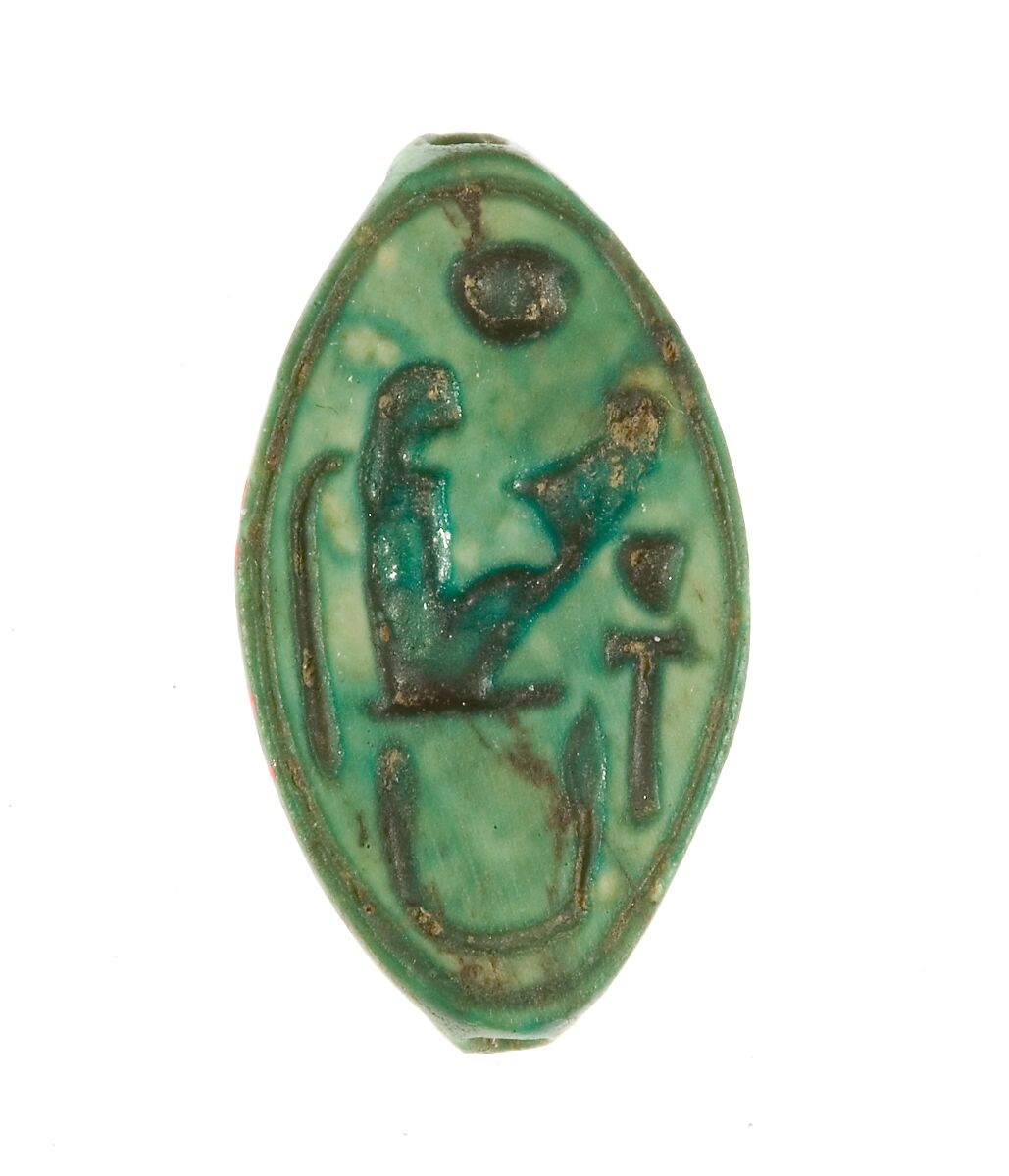 The inscription on the base of this cowroid records Hatshepsut's throne name, Maatkare, which may be roughly translated as Maat (the goddess of truth) is the life force of Re (the sun god). The two hieroglyphs on either side of the crouching goddess have the meaning "May She Live," or "Living" (ankh.ti).
