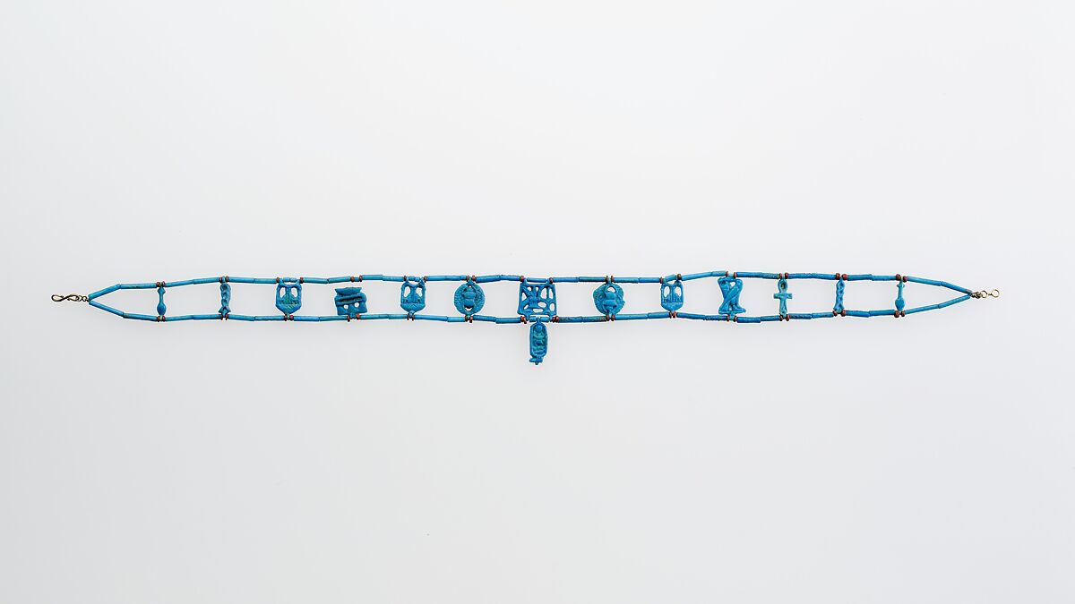 - Title:Necklace restrung with amulets and a faience cartouche bead of Tutankhamun