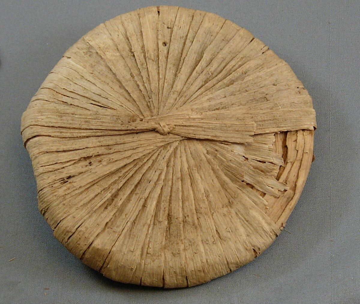 Part of Tutankhamun's "embalming cache," this was one of about 25 lids found inside a group of large jars that may have held food or drink used for the king's funeral ceremony. The jar it originally covered, with which it was no longer associated, may have contained food, or may have held embalming materials. This is one of six lids made by folding lengths of papyrus back and forth across a center point to create a flat circle.