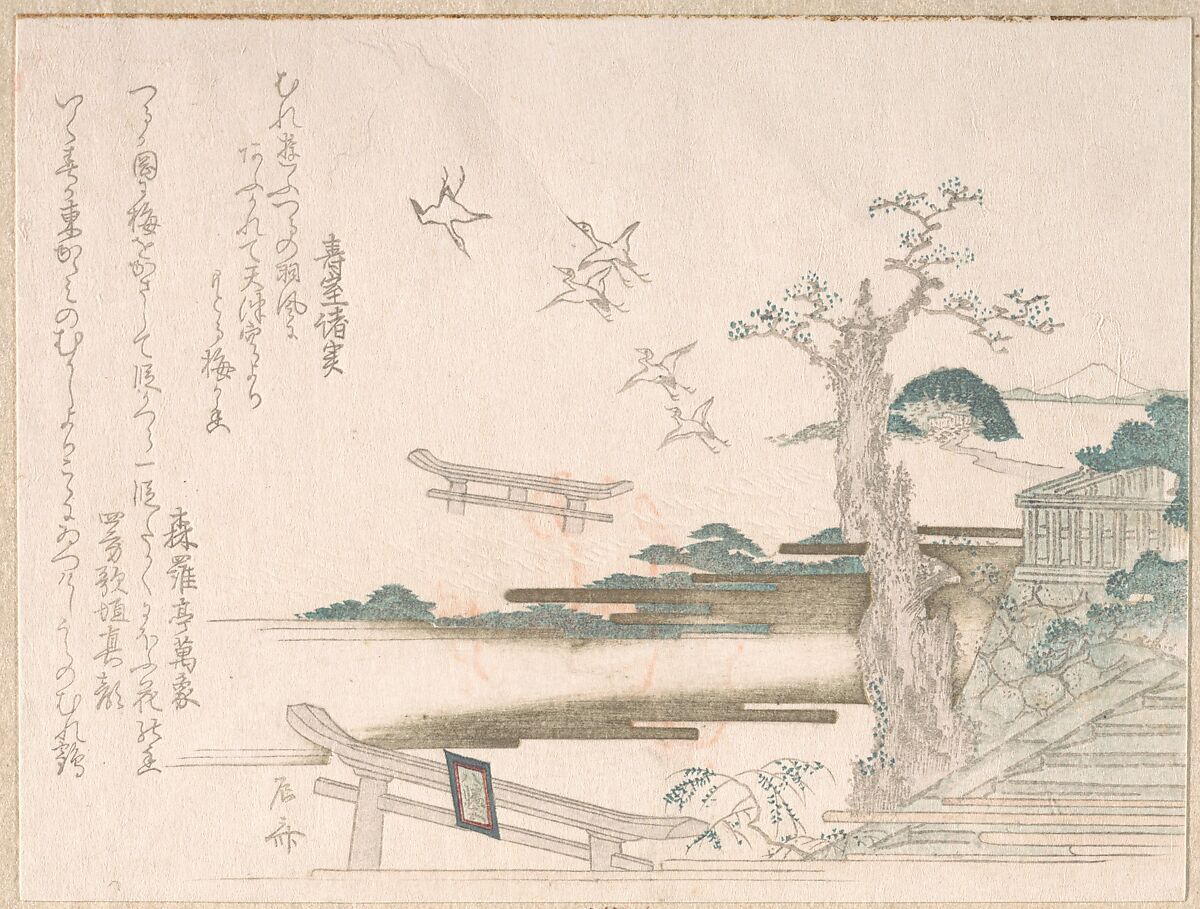 Spring Rain Collection (Harusame shū), vol. 2: Cranes at Tsurugaoka Hachimangō Shrine in Kamakura
