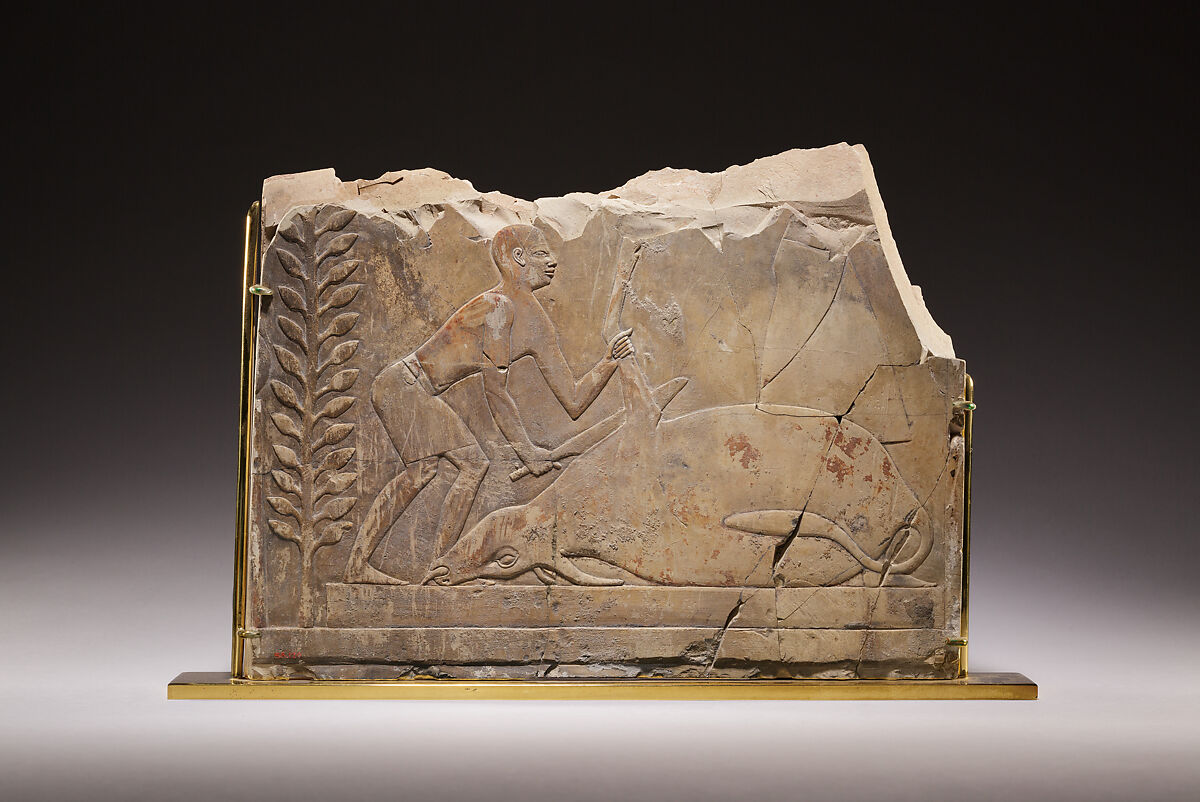 While the stone is poor and the walls of relief decoration in the tomb have greatly suffered, this relief has convincingly assigned to the west portico which opens from the west side of the first sunken court and leads to the second. This is the only area known to have raised relief at this point, and the north wall, which seems to have been concerned with the funeral procession and activities during the funeral, has been shown to be the location for this cattle slaughtering scene.