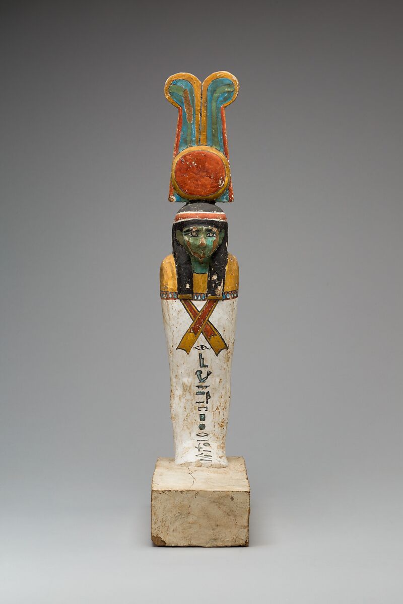 The figure is adorned with two ostrich plumes flanking a sun-disk that connects it to the solar cycle. The face is green, a color associated with fertility and new growth. Both the connection with the daily rising and setting of the sun and the link with the yearly agricultural cycle helped to ensure the perpetual rebirth of the deceased.