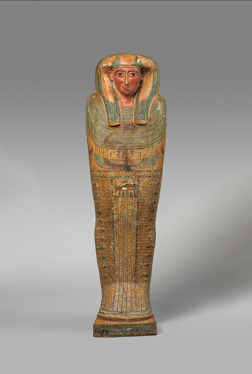 On the lower part of the lid exterior are a number of spells for the benefit of the deceased along with figures of protective deities. In the center of the chest is a vignette showing the ba, an intangible aspect of the transformed individual able to leave the body and the tomb by day and return at night, hovering above the mummy. On the back of the case is a djed pillar, representing the backbone of Osiris and thus identifying Wedjarenes with this god, who was linked to fertility and the agricultural cycle and was also the principal god of the dead. The decoration of the coffin overall, with the Osirian symbol on the back alluding to the earth and the Netherworld, and the winged Nut on the front evoking the sky, helps to create a miniature version of the world in which Wedjarenes could function for eternity.