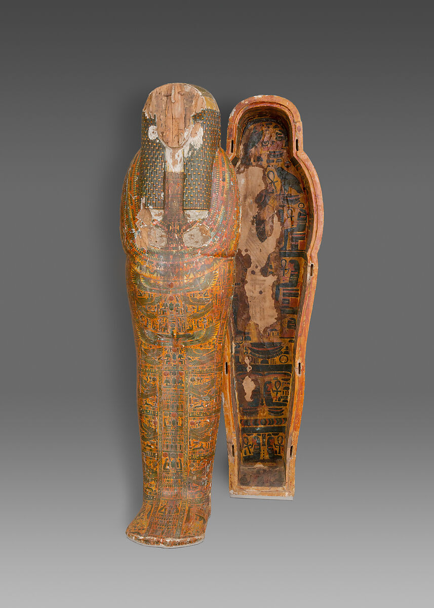 Djedmutesankh's burial was plundered in antiquity by thieves who removed the gilded parts of her coffins: the faces, earrings, breasts, and hands. On this inner coffin, they left most of the gilded fillet around her head, which was impressed with a floral design.