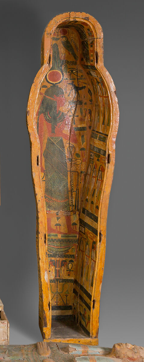 Gautsoshen was apparently buried in a single coffin, along with a mummy board. The lid of the coffin was badly crushed by stones falling into the burial pit and was left in Egypt. The interior decoration of the box is dominated by a figure of the Goddess of the West, holding a crook and an ankh. Included in the vignettes on the sides of the exterior is a female figure, likely meant to represent Gautsoshen but labeled as Neit, adoring various gods.