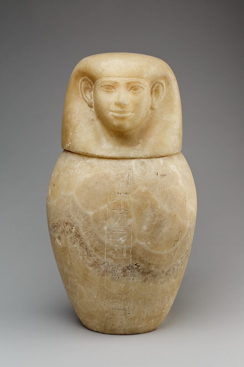Canopic jars were made to contain the embalmed viscera removed from the body in the process of mummification. The organs were placed under the protection of the Four Sons of Horus, whose heads form the lids of the jars: Hapy (baboon-headed), Imseti (human-headed), Duamutef (jackal-headed), and Qebehsenuef (falcon-headed). In turn these gods were under the protection of the goddesses Nephthys, Isis, Neit, and Selqet, respectively, as the inscriptions on the jars state.