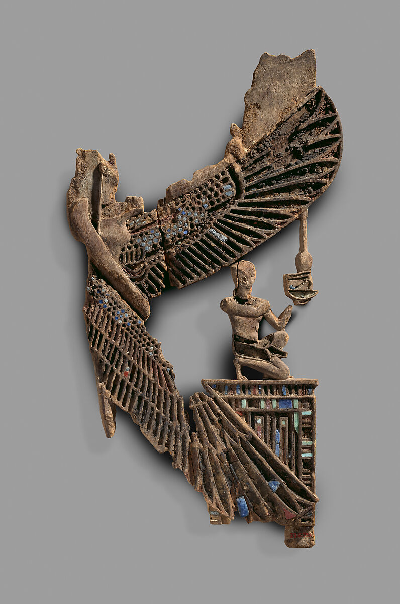The fragment from an openwork shrine panel depicts a goddess spreading her wings in protection of a small kneeling figure of a king. The king sits on a base decorated in the paneled palace-facade motif, and he offers a wedjat eye on a neb basket, the whole topped by a nefer sign. The wedjat eye is one of the 'great offerings' representing all offerings - like the round nu pot or the figure of the goddess Maat - and conveys that all good things are being rendered to the god by the king. The god in question is missing and would have been located in between this element and a mirroring element.