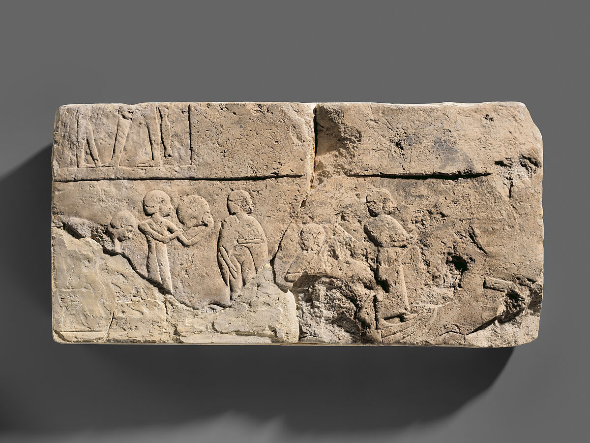 Although the original findspot of this block is not known, the scene is a good representative of northern tomb relief as it has been gathered and studied, and the block is testimony of rare subject matter. A group of women travel in a papyrus skiff. In the prow a woman with a long pole punts the craft. Behind her a woman sits low in the bottom of the boat holding a rectangular lyre. A third figure stands with her body facing the viewer, her dress raised to expose herself; she beats one hand against her thigh in time with the music. A following figure beats a round tambourine. The figure in the rear of the boat hunches forward, her arm raised behind her; although the figure is broken away, parallels suggest she probably slapped her bare buttocks to the beat. In front of the boat may be seen the stern of another boat. The register above this scene, preserved a bit at the upper left of the block, appears to have depicted offering bearers: traces show a larger figure headed to the left, who who holds an object that looks a bit like a surprise ball or a party favor but that represents a bundle of mats, an accessory often carried by offering bearers; a smaller figure faces the larger - probably the bearer's child clinging to and impeding the parent.