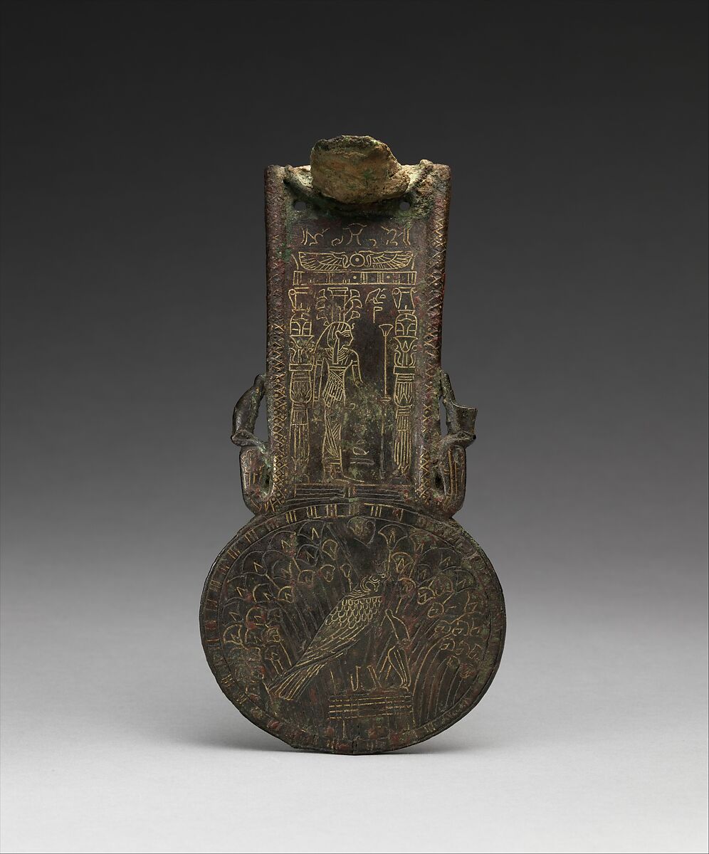 This menat was part of a compound item that included a large aegis – a god’s head above a collar – affixed to the front. This form developed from menats with attached goddess heads. When the latter type was held in the hand at the side, the divine face and collar, essentially an aegis, was directed toward the ground – an undesirable effect. The compound aegis-menat instead sets the divine head at right angles to the menat.