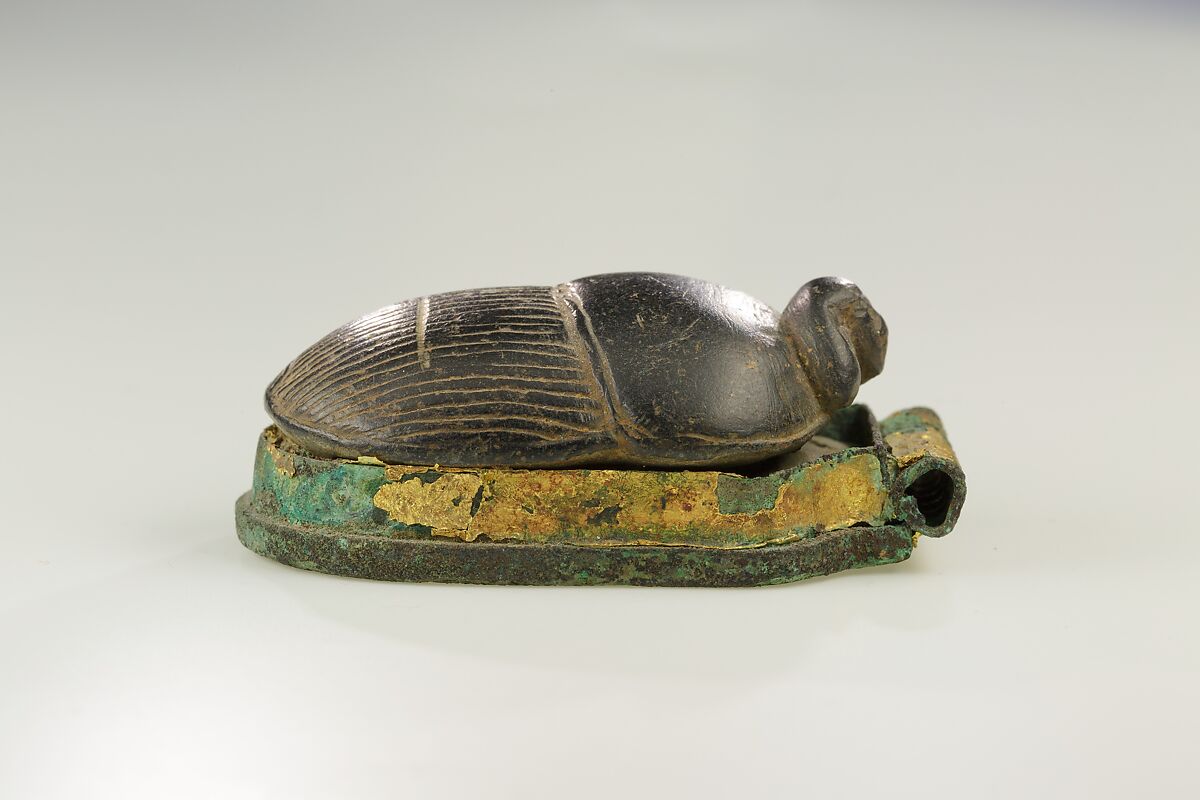 The underside of this scarab features two holes, a detail found in other human-headed heart scarabs as well. Presumably these were used to fasten the scarab onto a string. The scarab received an additional, gilded metal rim with a large loop for suspension at the top. This setting takes the shape of a heart and may have been added slightly later and covers parts of the hieroglyphs on the underside.