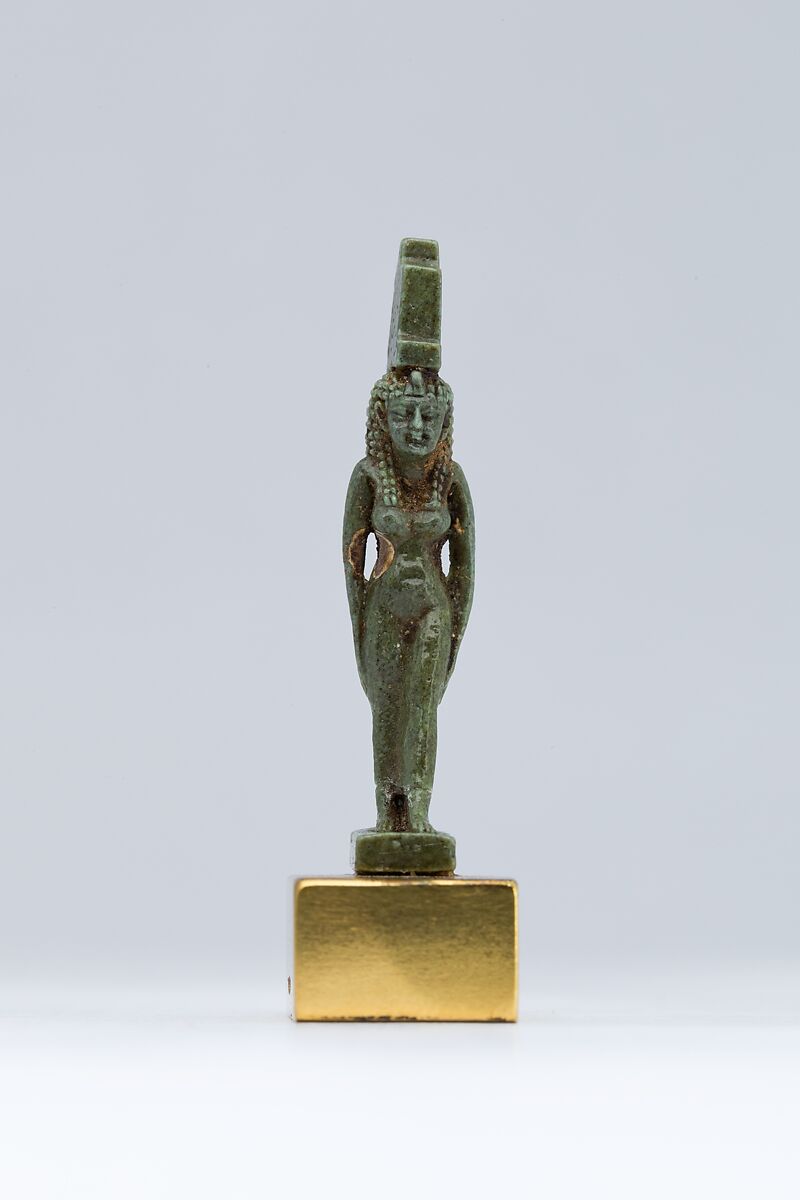 This exquisitely shaped amulet depicts the goddess Isis. On her head is a throne, which is the hieroglyph that represents her name. Isis was the quintessential example of a loving and caring wife as well as a nurturing and protective mother. She is often described as "The Great One of Magic" and this amulet was supposed to invoke her protection and versatile powers for the benefit of its wearer. The back pillar of the piece is pierced so that the amulet could be suspended and worn, for example on a necklace.