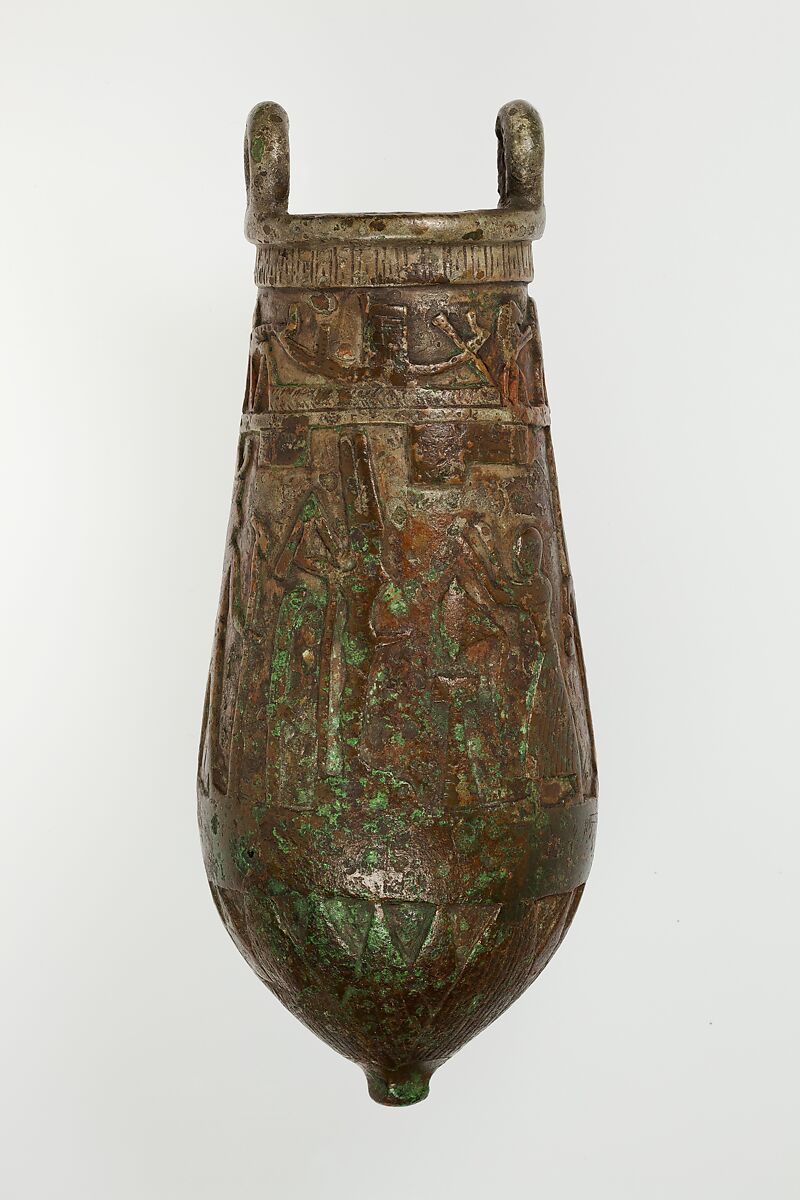 Situlae are vessels for libations.The type to which this one belongs is encircled with a particular arrangement of gods and scenes, and is frequently found, often with its loop handle still affixed. Examples are mostly rather small. Some examples with provenance (see 1976.63.3) seem to have been temple dedications. Unless there is excavation information, the objects cannot be closely dated but seem to relate to iconography popular from the Saite into early Roman periods.
