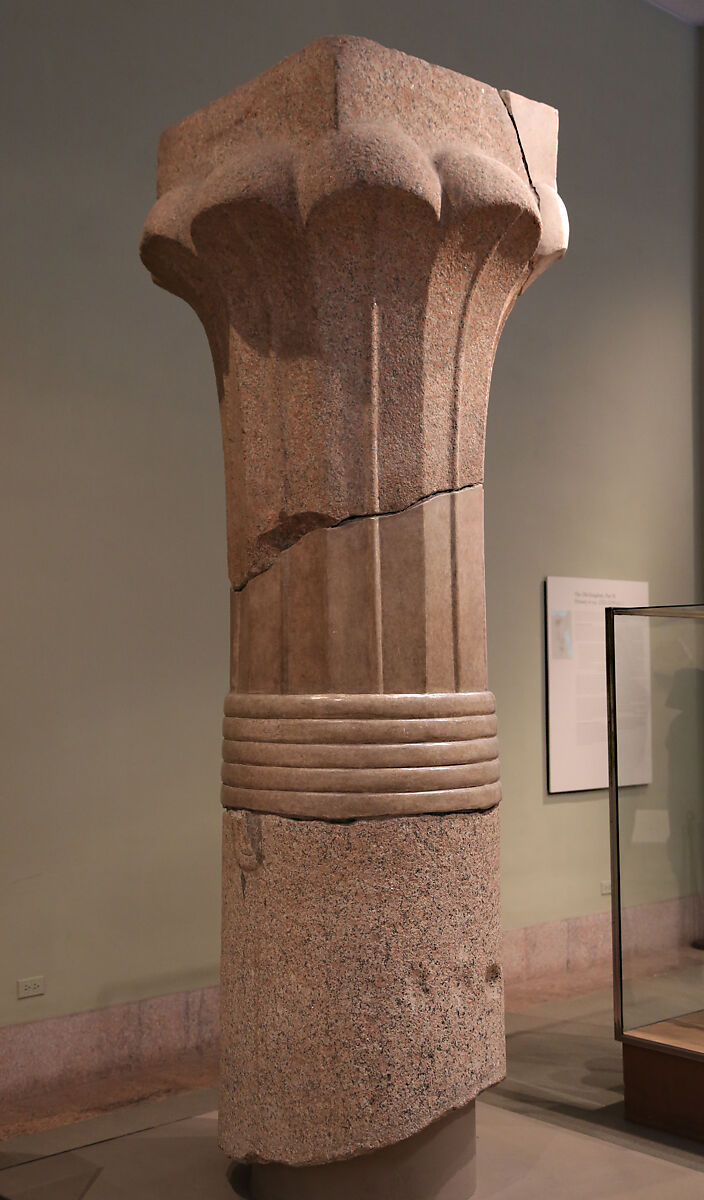 Two fragments from a column with a palm-leaf capital. The upper fragment includes much of the capital, with ribbed palm leaves supporting a square abacus. The lower section preserves a portion of the shaft, on which is carved a loop representing part of a rope that lay beneath a series of rope rings. These rings were not preserved, but have been reconstructed based on other examples.