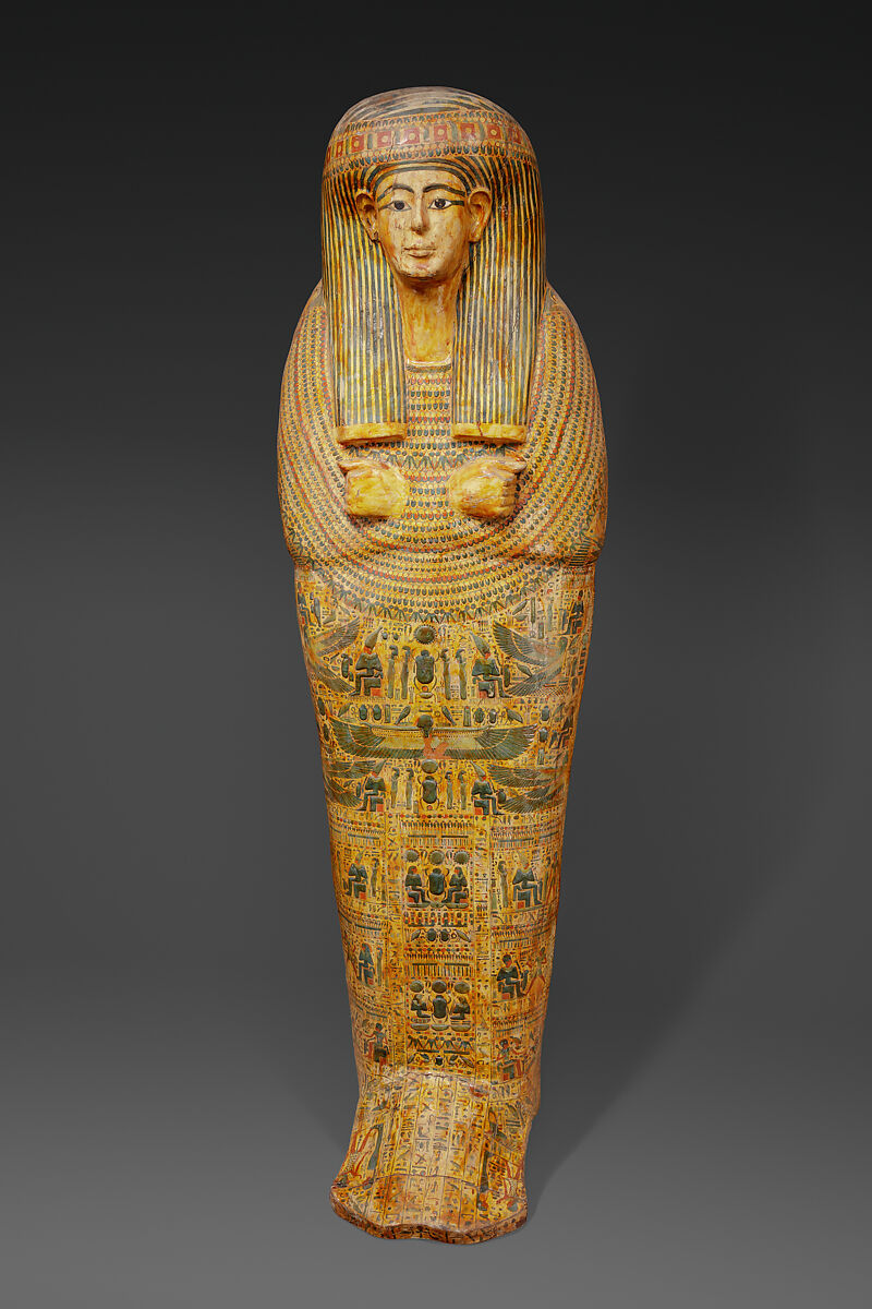 Inside Tabakmut's outer coffin (25.3.10a, b) was this inner coffin and a mummy board (25.3.12). As on the outer coffin, Tabakmut is shown in a long striated wig bound by a fillet; in this case, the long curled beard, associating the deceased with the god Osiris, is still attached to the chin. Around his shoulders and chest is an elaborate floral collar, from which his fisted hands emerge. As on the outer coffin, scenes relating to the worship of Osiris cover the lid below the broad collar, and ritual scenes connected to the gods of the Netherworld adorn the sides of the box. Tabakmut's name does not appear anywhere on this coffin.